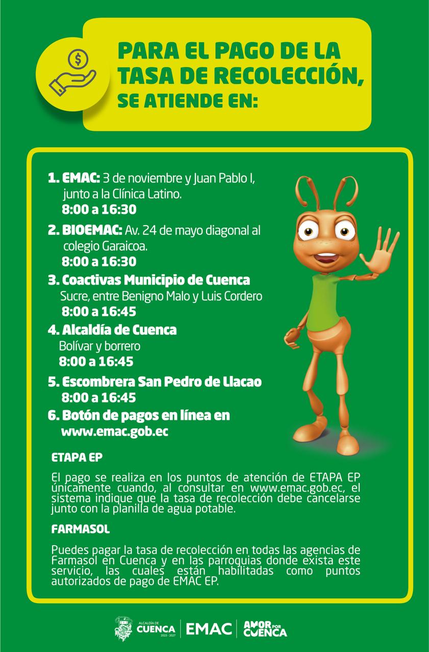 La EMAC EP informa que la ciudadanía puede cancelar la tasa de recolección en varios puntos presenciales, en Farmasol y a través del botón de pagos en línea disponible en www.emac.gob.ec