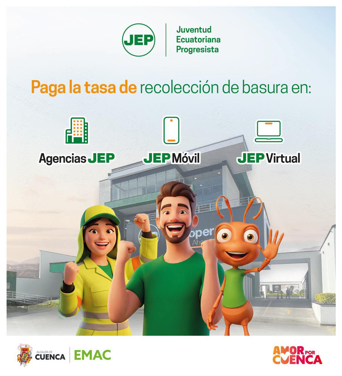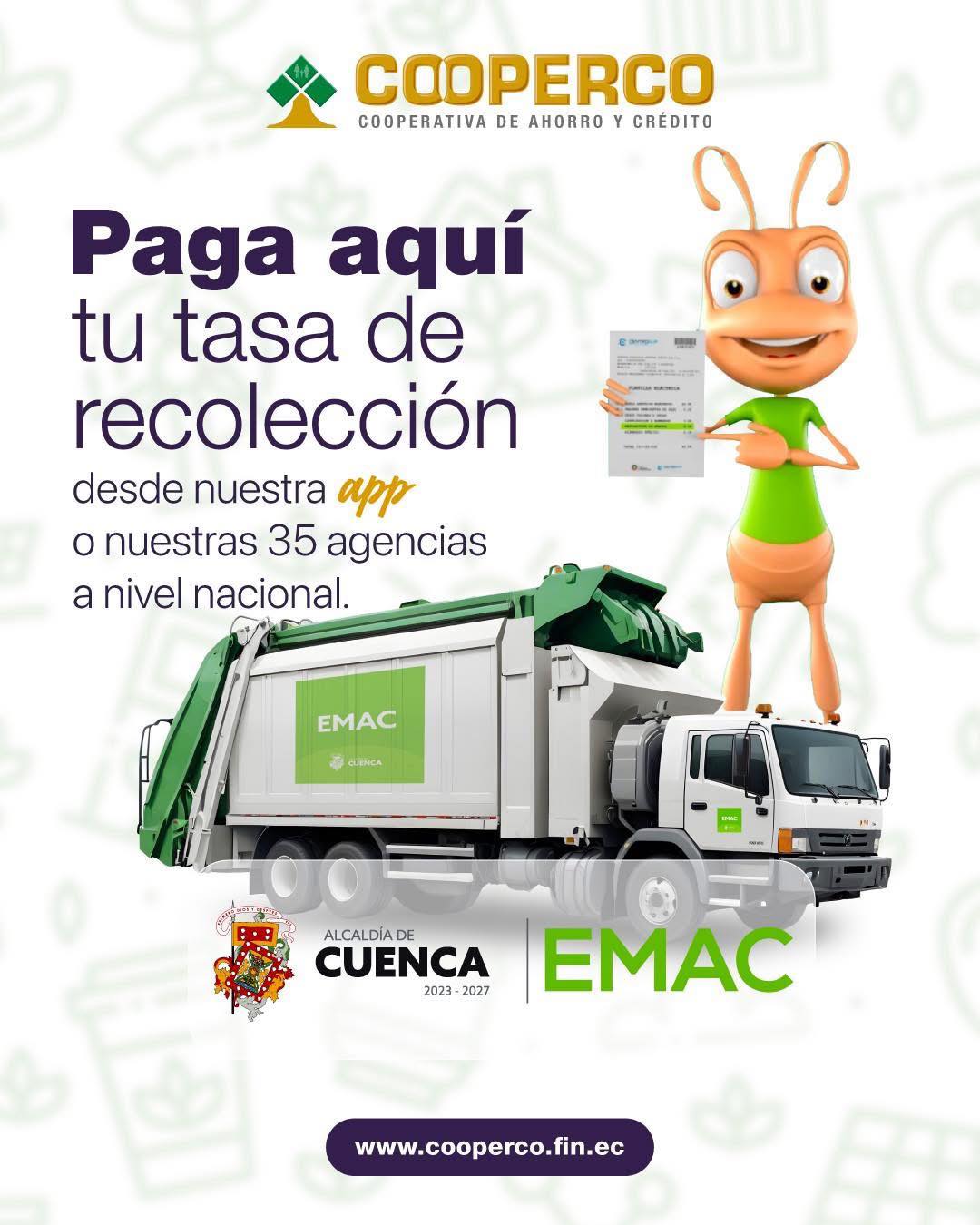 La Empresa Pública Municipal de Aseo de Cuenca, EMAC EP, informa a la ciudadanía que, desde el 1 de abril, la cooperativa JEP y la cooperativa Cooperco se sumaron a los puntos autorizados para realizar el pago de la Tasa de Recolección, ampliando y facilitando las opciones de servicio para todos los cuencanos.