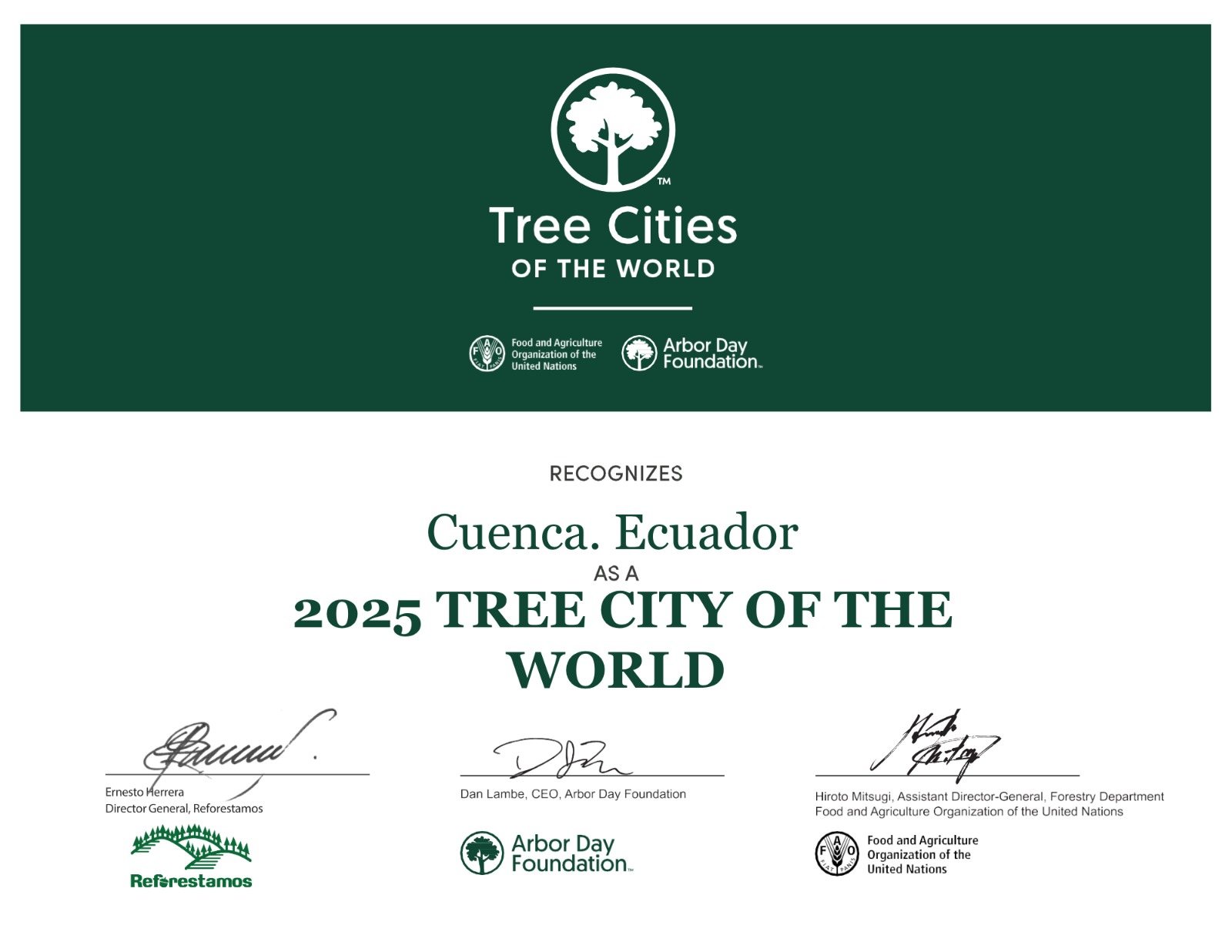 La EMAC EP informa con orgullo que la ciudad de Cuenca ha sido reconocida como Tree Cities of the World 2025, un prestigioso galardón otorgado por Reforestamos México, Arbor Day Foundation y la FAO. Este reconocimiento destaca aún más al conocerse que Cuenca fue seleccionada entre más de 200 ciudades del mundo, posicionándose como referente en la gestión ambiental y el manejo responsable del arbolado urbano.