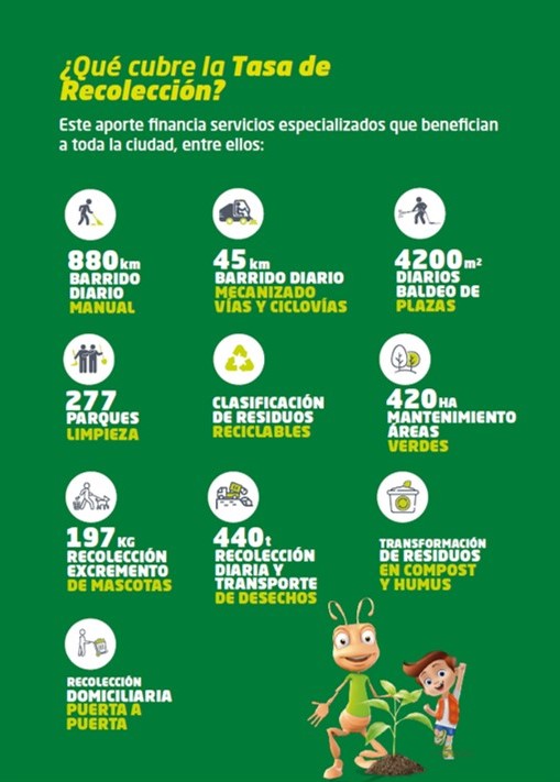 La tasa de recolección permite financiar una amplia gama de servicios que se ejecutan a diario en la ciudad, orientados a mantener espacios públicos limpios, áreas verdes en buen estado y una gestión responsable de los residuos.